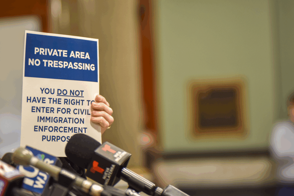 Smiley held up a copy of a red sign city employees will post noting the use of city property as a federal immigration enforcement staging site is now prohibited. In the event ICE officers are seen on any city-owned property without a judicial warrant, Smiley said Providence police will be required to vacate the federal agents from it.