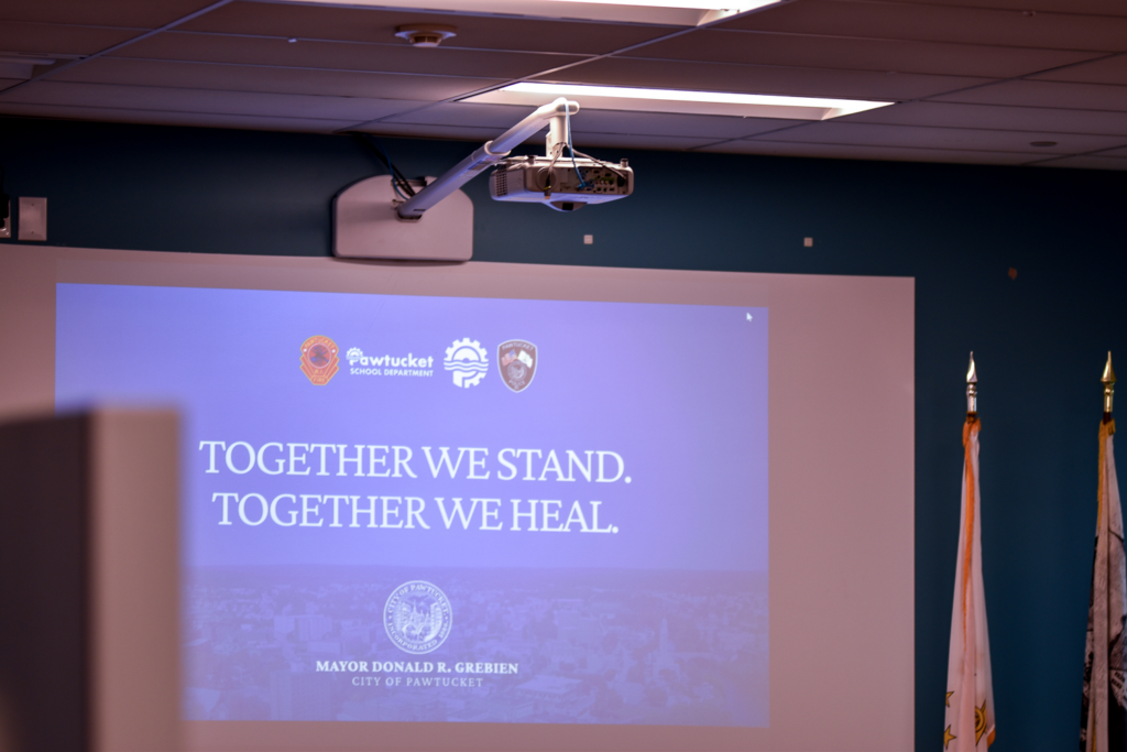 ‘Together we stand. Together we heal.’ reads a projection inside the Pawtucket Municipal Annex on Feb. 17, 2026. (Photo by Christopher Shea/Rhode Island Current)